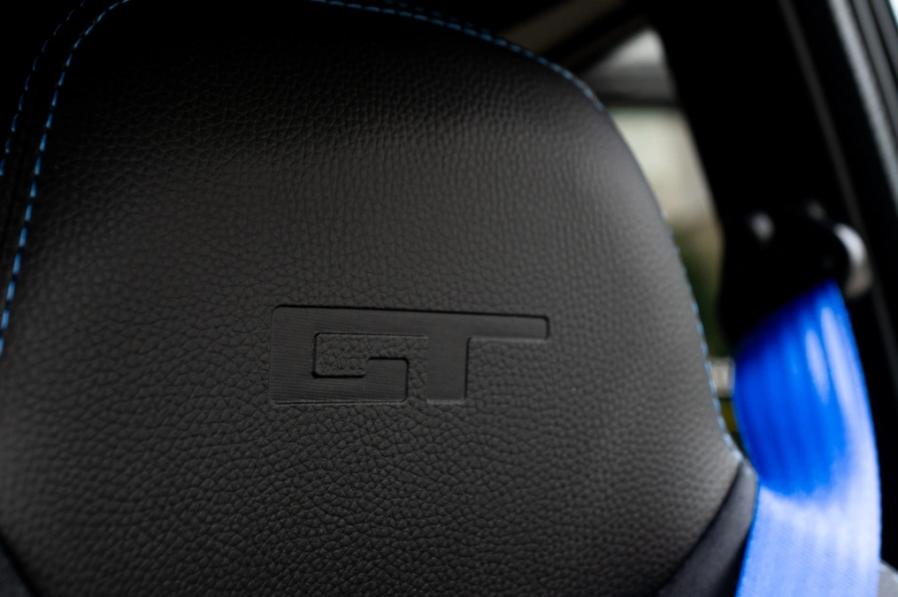 | Sellerie "GT" tri-matière avec surpiqures bleues et logo GT embossé sur appuie-tête |